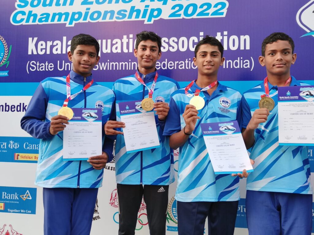 ಮಂಗಳೂರು: ತಿರುವನಂತಪುರಂ ನಲ್ಲಿ ನಡೆದ 33ನೇ ದಕ್ಷಿಣ ವಲಯದ ಅಕ್ವೆಟಿಕ್ ಚಾಂಪಿಯನ್ ಷಿಪ್ ನಲ್ಲಿ4×100 ಫ್ರೀ ಸ್ಟೈಲ್ ಈಜು ರಿಲೇಯಲ್ಲಿ ಗ್ರೂಪ್ 2 ತಂಡವೂ ನೂತನ ಕೂಟ ದಾಖಲೆ ಮೆರೆದಿದೆ. ಮಂಗಳೂರಿನ ವಿ ಒ